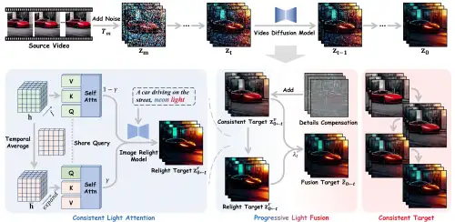 Progressive Light Fusion (PLF):利用光传输的独立性原理,通过线性混合来平滑光照过渡,确保视频帧间的光照一致性。