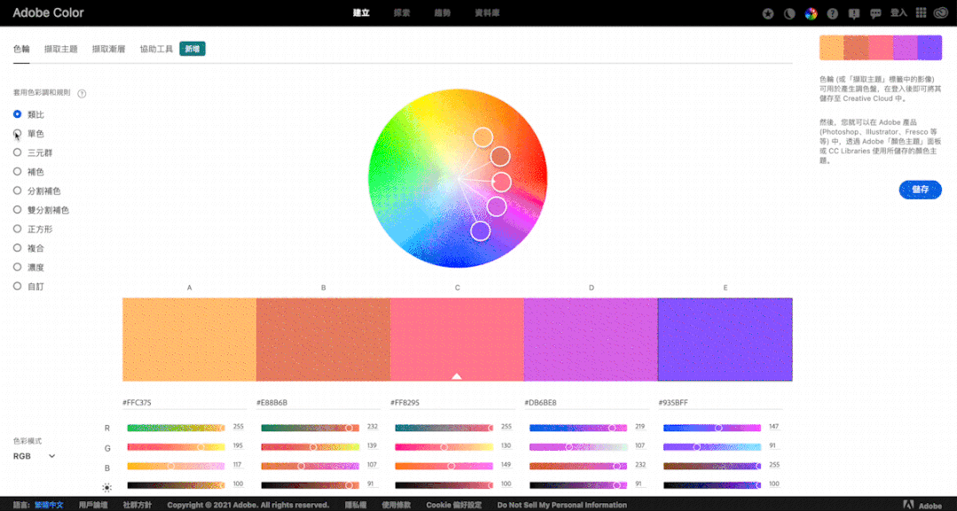 Adobe colors 具有超级强大的配色模式,一共包含 9 种智能调色模式可以选择,你需要用什么方式去调试颜色点击左方即可操作,色彩模式也支持 4 种,分别为:RGB、CMYK、HSB、LAB。
